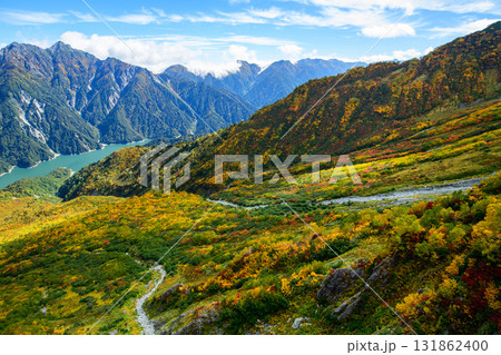 立山黑部阿爾卑斯山脈路線的壯麗景色:大觀峰的秋葉和富山縣黑部湖的遠景