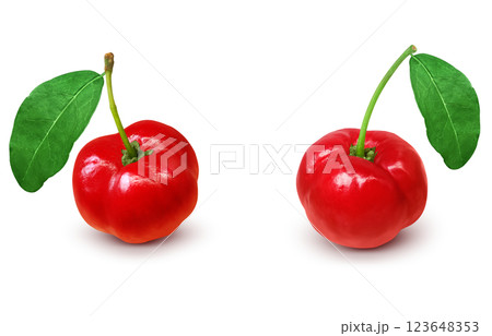 Acerola small cherry fruit with leaf isolated on white background.