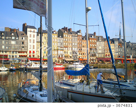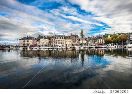Honfleur iconic Vieux Bassin harbor in Normandy, France. Picturesque scene features historic slate-fronted buildings, a large Ferris wheel at horizon and boats moored at the dock