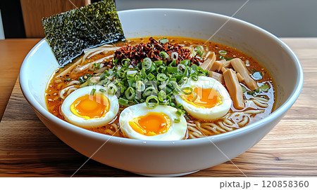 High sodium meals. steaming bowl of gourmet ramen with rich, salty broth, topped with soft boiled eggs, green onions, and seaweed, creating savory delight
