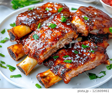 High sodium meals. Juicy BBQ pork ribs with caramelized sauce and fresh herbs on white plate. ribs are garnished with green onions and sprinkle of salt, creating mouthwatering presentation