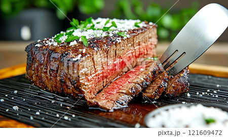 High sodium meals. Juicy steak with salt crust and herbs on grill, showcasing its tender texture and rich flavors. perfectly cooked meat is sliced, revealing succulent interior