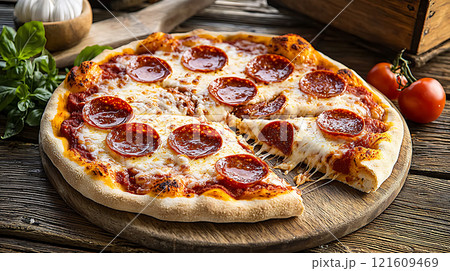 High sodium meals. Classic pepperoni pizza with extra cheese on wooden board, surrounded by fresh tomatoes and basil, creating delicious and inviting scene