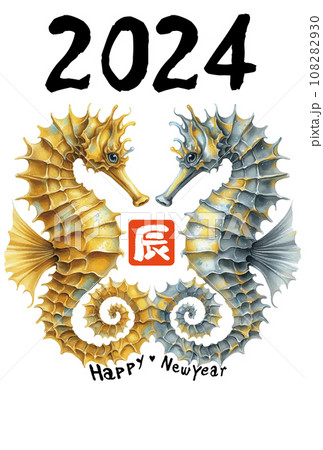 新年卡2024年龍年明信片模板,一對金銀海馬的水彩插圖