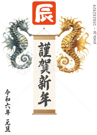 新年卡 2024 年龍年明信片模板,兩隻金銀海馬插圖和一張投注卡