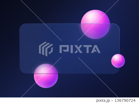 Dark glass morphism background with frosted transparent square panel and vivid magenta gradient spheres.