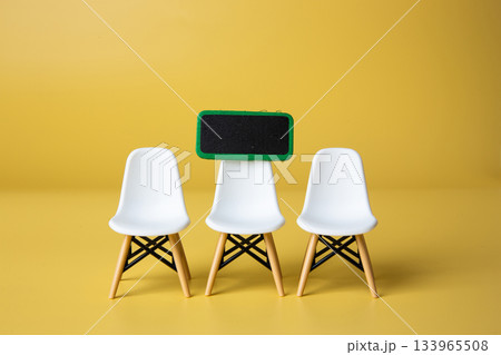 Miniature chairs with blank chalkboard representing recruitment opportunity