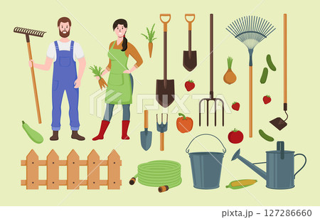 Cartoon Color Characters People Farmers and Equipment Concept Flat Design Style. Vector illustration of Vegetable, Bucket, Pitchfork and Fence