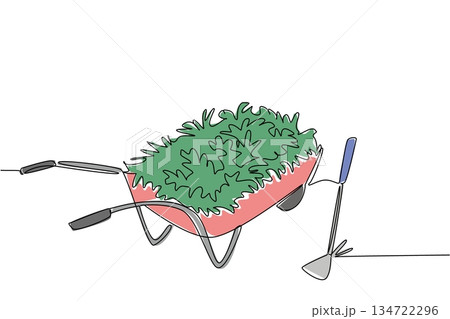 One line drawing of a wheelbarrow overflowing with weeds or garden refuse, next to small gardening tools such a hoe, symbolizing the effort and bounty of garden cleanup. National Weed Your Garden Day