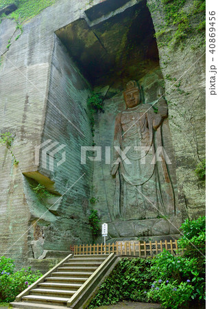 窺視地獄的岩石(日本千葉縣鋸南町鋸山上的寺廟,垂直構圖)
