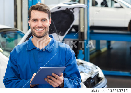 Male auto mechanic standing in workshop holding tablet and inspecting white sedan on hydraulic lift