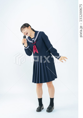 身穿水手服拿著麥克風唱歌的女學生全身照