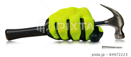 Hand with Protective Work Glove Holding an Old Steel Hammer