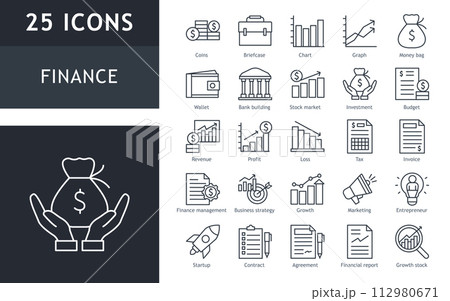 set of line icons related to finance, business, bank, money, economic, currency, exchange, investment.