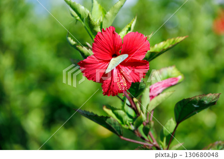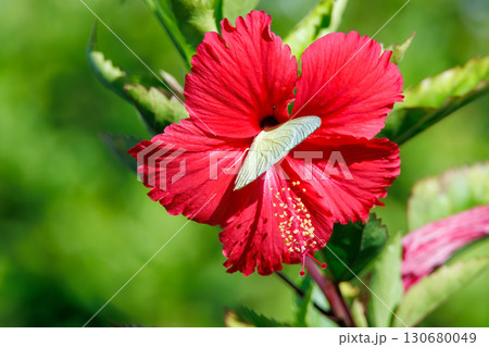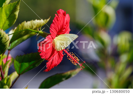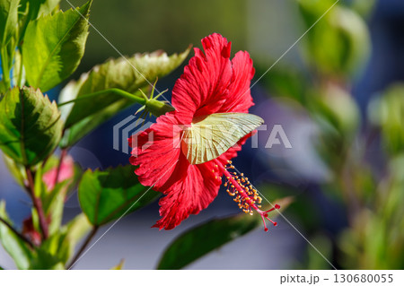 港口盛開的鮮豔芙蓉花和一隻正在吸食花蜜的粉蝶(粉蝶科)。沖繩縣那霸市那霸泊港 - 2025年
