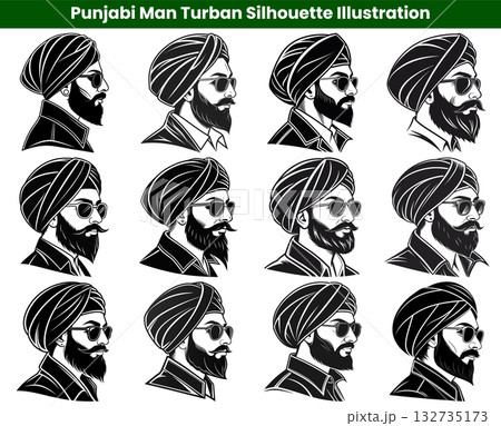 Black and White Illustration of Punjabi Men Wearing Turbans and Sunglasses in Silhouettes
