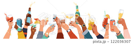Diverse people hands holding alcohol drinks illustration