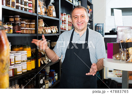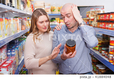 Glad family couple discussing in the food store