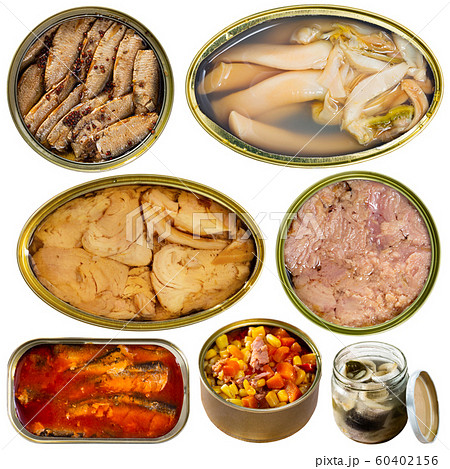 Assortment of canned preserves food in cans,