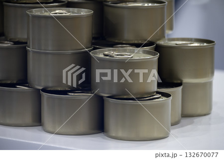 Close up scene the piles of tinned can food.