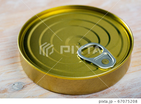 Canned tuna fish in can over wood