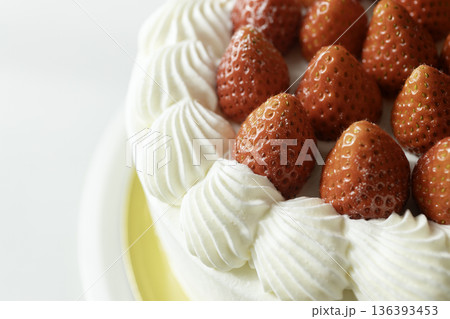 草莓蛋糕特寫:一個自製的裝飾蛋糕,上面散落著草莓,背景是白色。