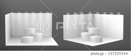 3D booth mockup, white walls and round podiums