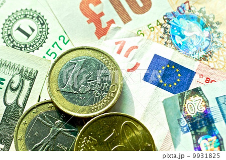 Banknotes: dollar, euro, british pound sterling, euro cents.