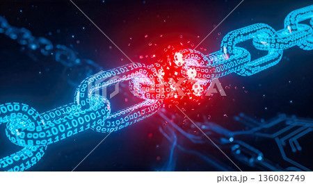 glowing blockchain link breaking apart red explosion digital security failure cyber attack risk disruption technology concept