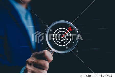 Business Target and Marketing Strategy Concept. Businessman holds magnifying glass focusing on target with arrow in bullseye, precision, goals, marketing success, Goal objective strategy plan action,