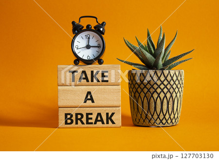 Take a break symbol. Concept words Take a break on wooden blocks. Beautiful orange background with succulent plant and alarm clock. Business and Take a break concept. Copy space.