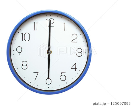 Wall clock with blue frame showing 11.00 11.00 or 23.00 O clock on white background, suitable for time related articles, education, or punctuality concepts