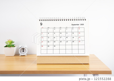 September 2025, Monthly desk calendar for 2025 year on wooden table.