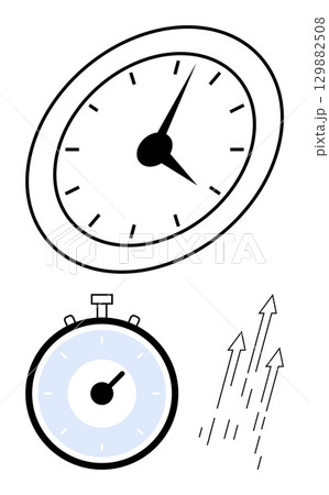 Large wall clock small stopwatch and arrows pointing up representing different aspects of time. Ideal for productivity, deadlines, efficiency, progress, time management, speed, and growth. Line