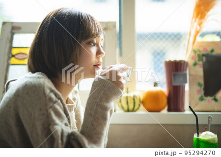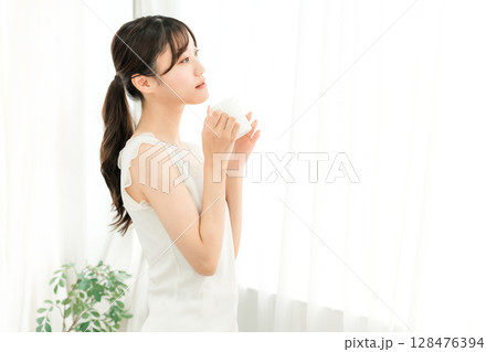 早上在家放鬆的亞洲女性喝熱水、咖啡、熱飲、牛奶咖啡、拿鐵