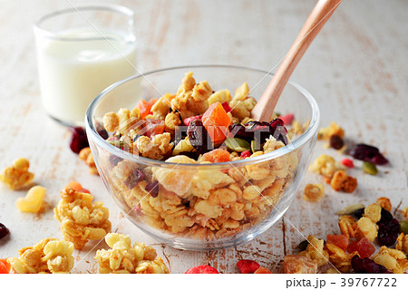 Granola, oat flakes and chocolate, healthy food for breakfast concept