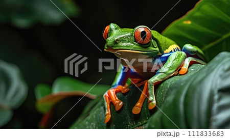 A red-eyed tree frog sits on top of a green leaf, Ai Generated