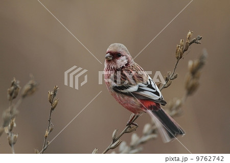 一種美麗的酒紅色和白色的冬季鳥,來自北方,在冬天的雪山上可以看到。