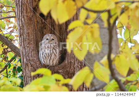 Ezo 貓頭鷹在森林中的樹洞中休息