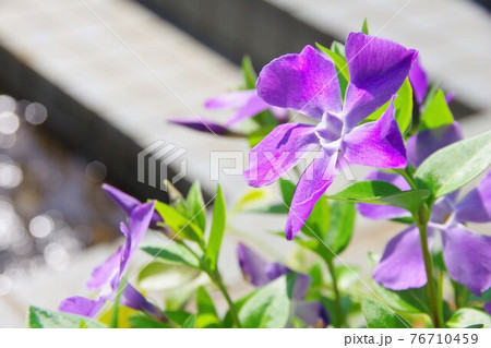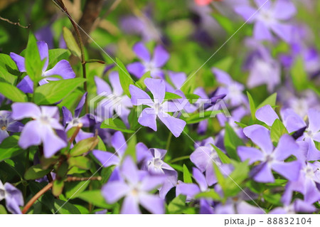 Purple blue flowers of periwinkle, vinca minor