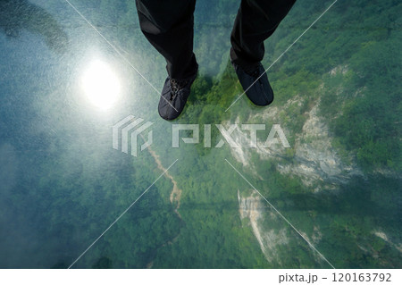 View from Zhangjiajie Grand Canyon glass bridge down to the forest below. Traveler put on shoe cover to protect the glass from getting scuffed by shoe.