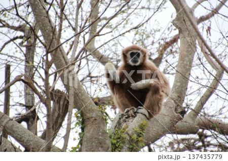 白手長臂猿坐在樹上凝視