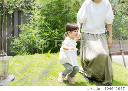 母親和女孩在花園裡玩耍的照片
