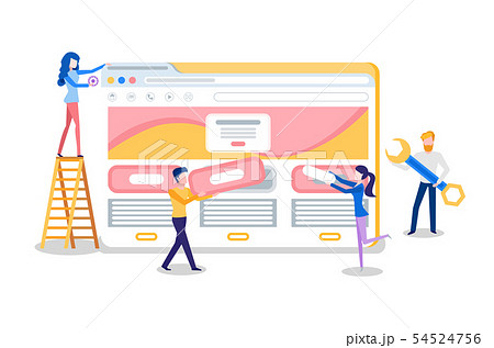 Characters making web pages. Peoples decorated websites team in business marketing scenes simple stylized vector illustrations