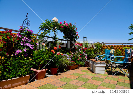 園藝快樂的日子 寬敞的屋頂陽台 盛開的玫瑰和鐵線蓮