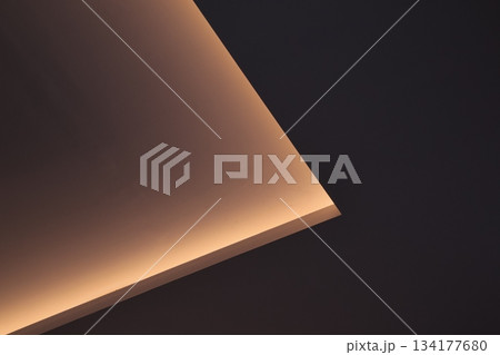 A minimalist interior close-up shows warm indirect lighting along an angled ceiling