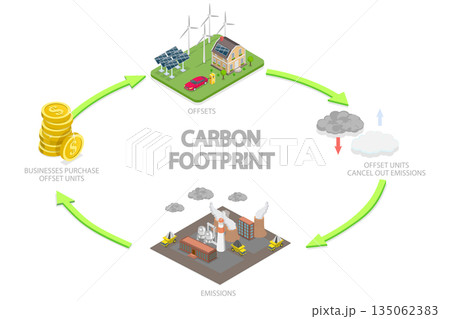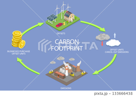 3D Isometric Flat Vector Illustration of Carbon Footprint, Diagram Outlining Carbon Footprint Cycle With Offset And Emission Stages.