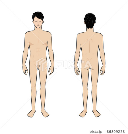 用筆觸如筆跡對亞洲年輕男子進行美容和操縱治療的全身裸白色背景的圖像插圖