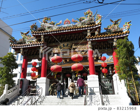 日本橫濱城市景觀二月。橫濱中華街和關帝廟街的景色。後面的「天長門」和橫濱世界=第8名