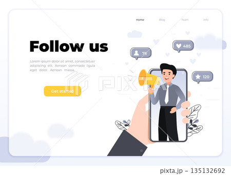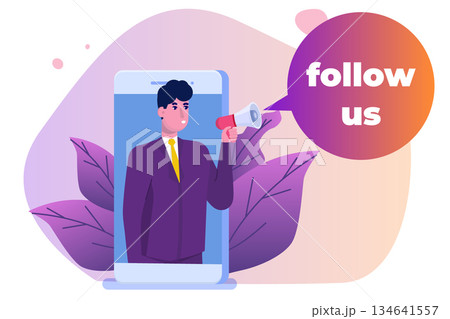 Smartphone with a man shouting in loud speaker with Follow Us bublle speech. Social media network promotion, Influencer marketing. Vector illustration.